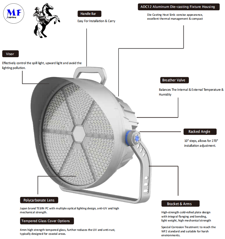 Mingfeng Lighting proudly presents its High Mast Light, a powerful and durable lighting solution designed for large outdoor spaces. With a 1200W LED power input and an IP66 rating, this high mast light can withstand even the harshest of weather conditions.