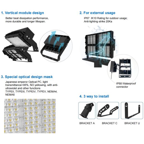 1.Vertical module design, better heat dissipation performance, more durable and longer lifespan. 2.3 way to install : bracket installation /Pole installation / Wall installation for option. 3.Built-in driver, lP67 waterproof plus shell protection, double protection, much safer 4.Light uniformity, high quality No Light pollution, 1- 10V/PWM/ Triac dimming